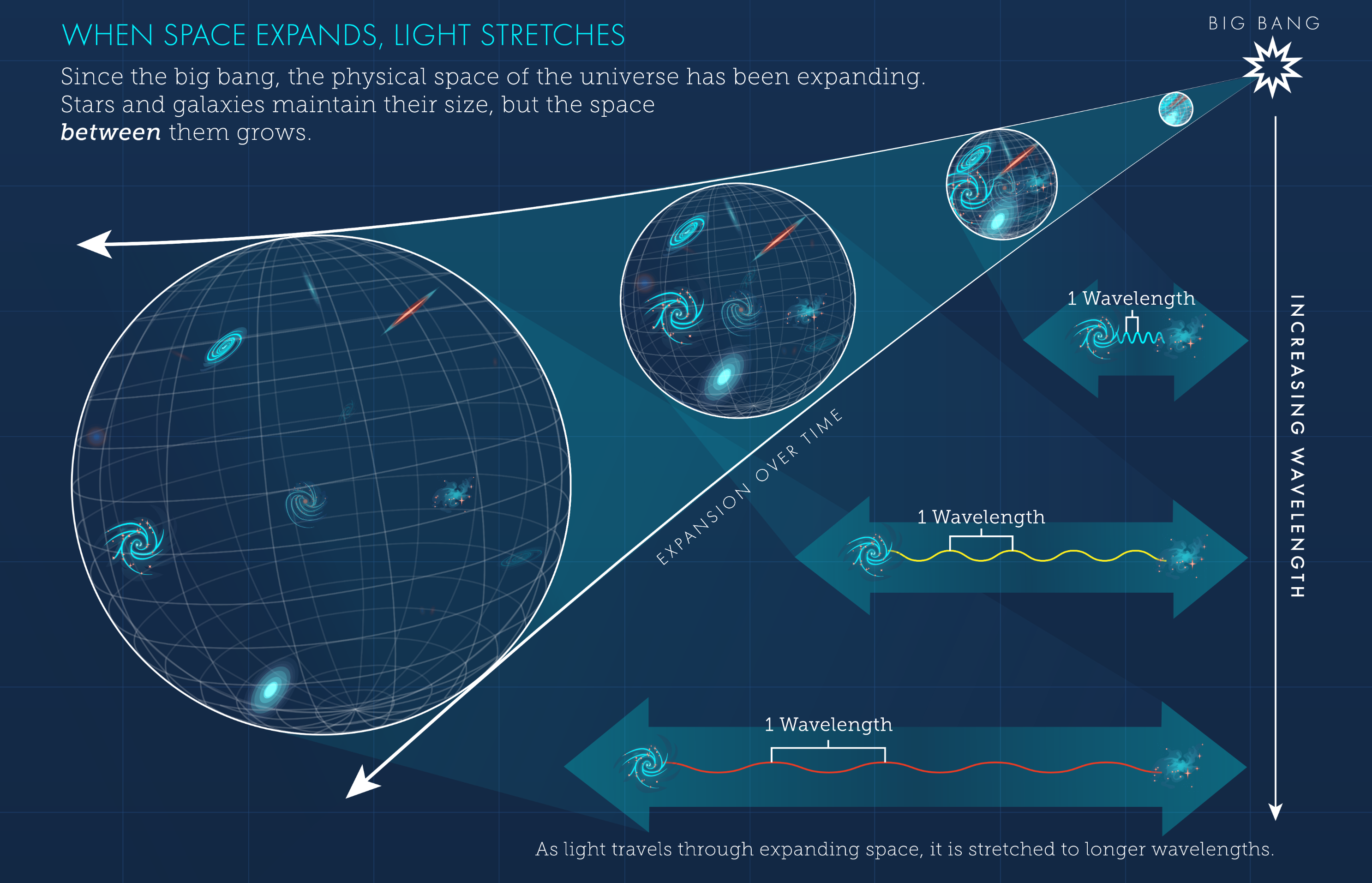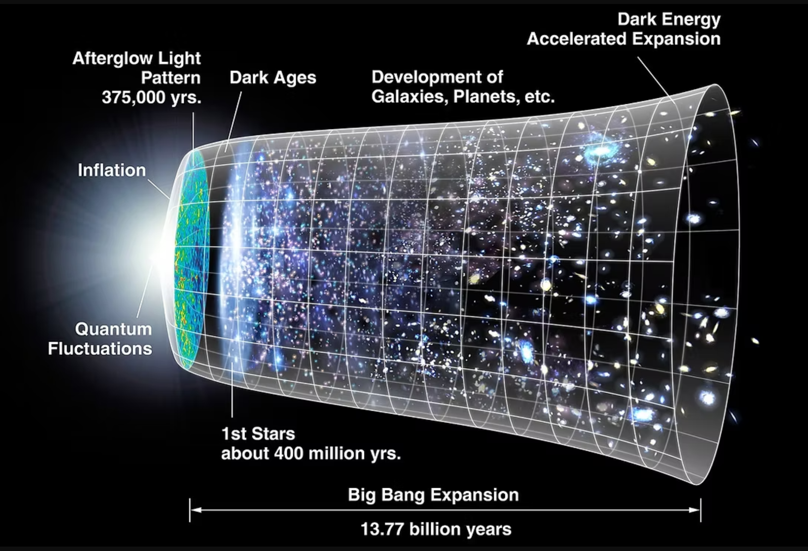 The discovery of the Cosmic Microwave Background (CMB) in 1965 by Arno Penzias and Robert Wilson provided a second, independent line of evidence for cosmic expansion. The CMB is the thermal remnant of the early universe, originating approximately 380,000 years after the Big Bang when the universe cooled sufficiently for photons to decouple from matter. This radiation, now observed as a uniform 2.7 K microwave glow, has been stretched over billions of years due to the expansion of space itself [1]. Subsequent missions including COBE in 1989, WMAP in 2001, and the Planck satellite in 2009 have produced increasingly precise measurements of the CMB’s temperature fluctuations. These fluctuations correspond to density variations in the early universe that later evolved into galaxies and large‑scale structures. Modern analyses, such as those summarised by NumberAnalytics (2025), highlight the CMB’s crucial role in reconstructing the universe’s expansion history and validating inflationary models [3]. The CMB remains one of the strongest and most direct confirmations that the universe has been expanding and cooling for billions of years.